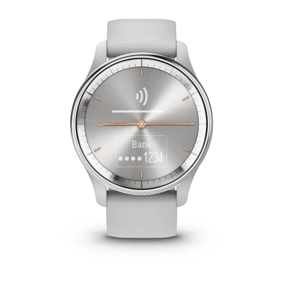Ceasul inteligent hibrid vívomove® Trend îţi oferă un design analogic clasic şi funcţii inteligente esenţiale, cum ar fi notificările pentru smartphone şi plăţile fără contact Garmin Pay™.